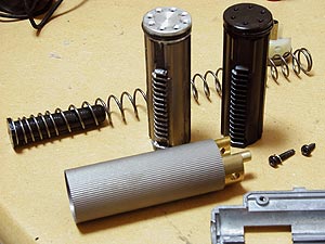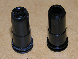 ![]() 先端に十字の切り書きがあるのが純正。ノーマルは吸気穴がピストンヘッドにないので、ノズルで吸気する。ヘッドを替えればその必要はなくなるので密封性の高いエアシールノズルへ変更。 |