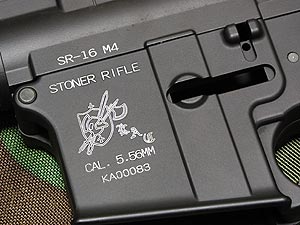 ![]() G&Gのメタルフレームにはいくつかの刻印バリエーションがあるが今回はSR-16 M4をチョイス。シルクプリントは濃淡があり、綺麗とは言えない。使っているうちに剥がれてきそうだ。 |