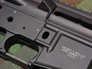 ![]() ブッシュマスターのハンドガード。実銃用なのでそのままでは電動ガンに装着できない。質感は梨地加工がされていてとても良い。 |