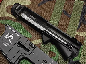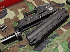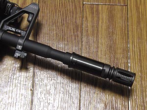 ![]() バッテリー収納用にハンドガード裏とアウターバレル中央のくびれが気になるが、ハンドガードはブッシュマスター製を入れるので関係なし。ガスチューブはパイプではなく棒タイプ。 |