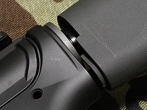 ![]() G&Gの難点。このストックリングの形状、テレスコピックストックだと取り付けに苦労するだろう。しかもこのパイプパーツがシステマに比べ数ミリ長い。 |