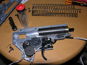 ![]() サブM4のメカボックスをフルチューンしてみる。ノーマルなのはセレクタープレートと逆転防止ラッチくらいか。あ、あとトリガーはノーマルの方が動作確実。 |