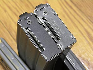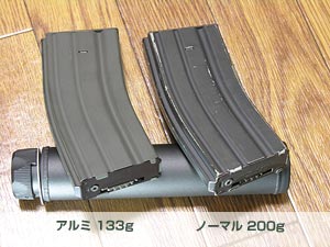 ![]() 唯一の難点がこの底板。右はマルイ純正マガジンだが、アルミマガジンには刻印がない。取り替えてしまおうか...。また六角径が違うが、ネジ径は同じ。 |