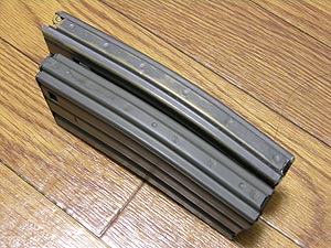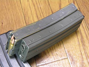 ![]() 実物マガジンとの比較。色味はやや実物の方が青っぽいが、実物もいろんな色があるので気にはならない。むしろマットな緑っぽいグレーで格好良い。 |