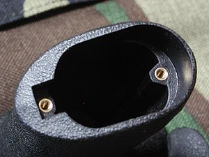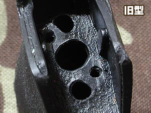 ![]() フロントサイト下面。G&Pはマルイ同様にイモネジ固定式。GUARDERは穴は空いているがイモネジ固定ではない。G&Pは成型が荒く、バヨネット固定金具が曲がっている。GUARDERはこの部分の形状がマルイ互換ではない。 |