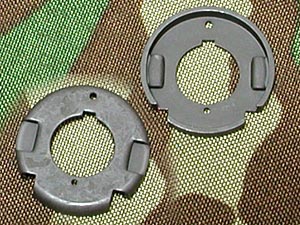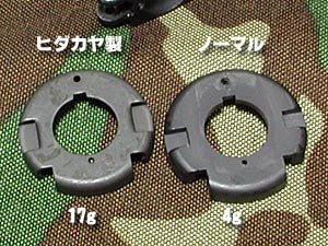 ![]() ヒダカヤのハンドガードキャップはスチール製で純正のプラ製に比べ肉厚が薄くなっており、直径が約2ミリ小さい。重量は17g。ノーマルプラパーツは4g。整合性は抜群でとても良く出来ている。 |