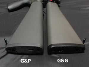 ![]() 左から、マルイ、G&P、G&G。マルイのまんまコピーのG&Gに対して、G&Pはバットプレートのエッジが切り立っている。 |