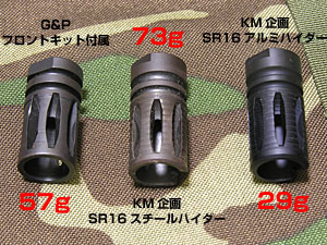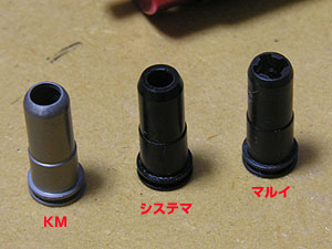 ![]() KMのカスタムノズルを組み込んでみた。先端がラウンドカットされているのが特徴。段差の位置が違うのが気になる。 左からKM企画製ラウンドカスタムノズル、システマ製エァ・シール ノズル、マルイ純正。 |