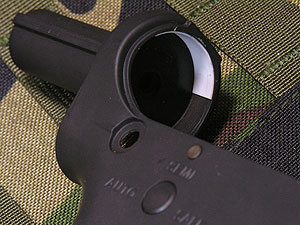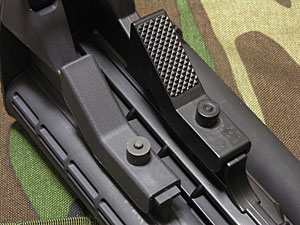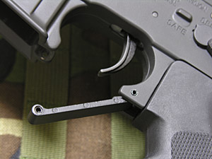 ![]() トリガーガードは亜鉛ダイキャストで、成形痕が残っていてちょっと微妙。セレクターの感触はノーマルより重いがクリック感は適度にある。あまりピシッとした感覚ではない。 |