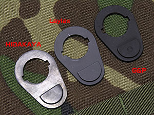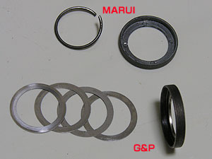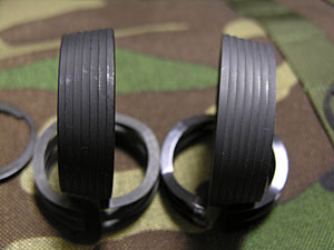 ![]() マルイ純正のハイダーワッシャーは写真のようにスプリングと凹みのあるリングで構成される。これが厚みがあり、何とも「もっさり」とした印象を与えてしまう。G&Pも同じ構造で、ハイダー角度調整用のワッシャーが付属するがマルイ同様のためやはりカッコ悪い。 |