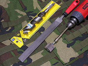 用意したのは左の写真の工具類。内面の角を削るための長い平ヤスリと、ストックチューブ径もマルイの29.0mmに対してGUARDERは29.8mmと径が大きいので、内径を広げるためのフラップホイル(円筒形の紙ヤスリ)と奥まで届くようにエキスパンションシャフトを揃えた。また、念のため30mm径のドリルも用意したがこれはほとんど使わなかった。だいたいストレス無くストックを伸縮するには内径30mm程度に広げる必要がある。 |