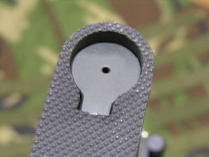 ![]() 刻印はシステマに比べ太く、はっきりとしている。写真のマガジンキャッチはG&Gのスチール製(正確には粉末冶金、焼結合金ともいう)に換装。これがなかなか良い。 |