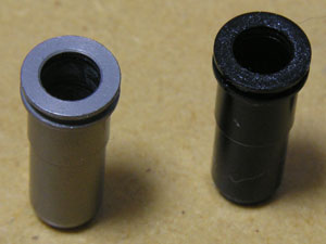 ![]() 内側のエア漏れシールOリングは2重となっている。 組み込んだ結果、射撃時の音がこもったようになり、密閉度が高まったような気がするが、初速には変化がなかった。ただし、ほんのわずかに初速が安定したので、命中精度が良くなる傾向にあると言える。 |