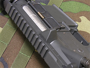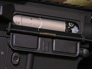 ![]() せっかくなので、ダストカバーを開いた方向にテンションをかけて、シルバーのボルトを使用してみた。アクセントになって美しい。ただ惜しまれるのはボルトカバーが閉まらないこと。 チャージングハンドルを引けばボルトが後退してホップダイヤルの調節が可能な点はノーマルと同じ。 |