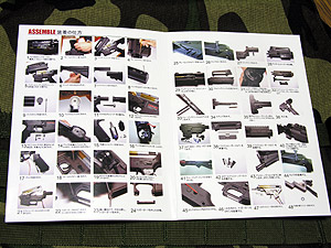 ![]() 日本語フルカラー写真付きの分解・組み立てマニュアルが付属する。ストックリングはライラクスのM16ストックリング可変タイプ(\2,100/スーパーガン)を使用。 |