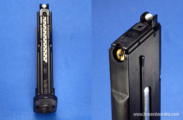 マガジンの装弾数は6mmBB弾22発になります。既存のBBローダーでは、装填は難しく、1発ずつ手で込めるほうが早かったです。バルブ開放時に気密を保つための円形の新型パッキンを採用しています。その他バルブを含め、マガジンには特許取得の新機構が盛り込まれています。またバルブは安全上から分解できないよう配慮されています。