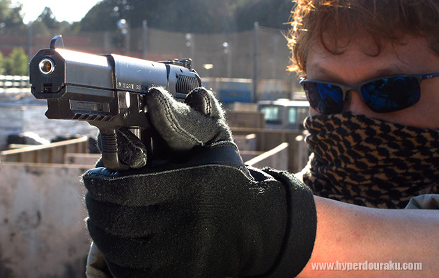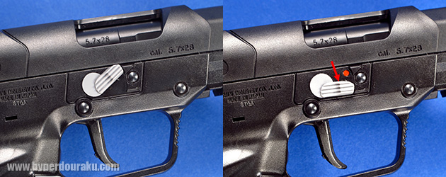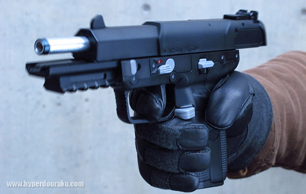 セフティはアンビ仕様でトリガーの上にあります。赤い点がみえる状態で「FIRE」です。慣れればトリガーフィンガーで操作できます。チェンバー、スライドも実銃と同様の5.7×2.8の刻印が日本仕様のみ施されています。
