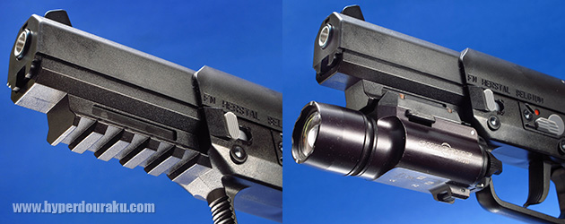 現代のハンドガン必須のピカティニー規格のアンダーレイルも標準装備しています。シュアファイアなどのタクティカルライトが装着できます。