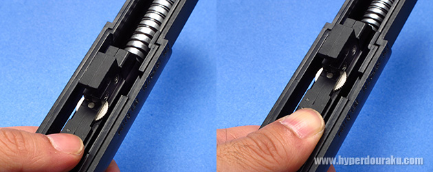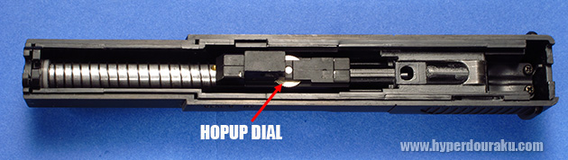 ホップアップの調整はバレルを押し、調整ダイヤルをスライドの切り欠きに合わせると調節しやすいです。
