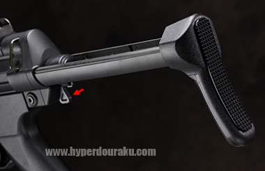 レシーバーエンド下のストックリリースレバーでロックを解いてストックを伸縮させる。