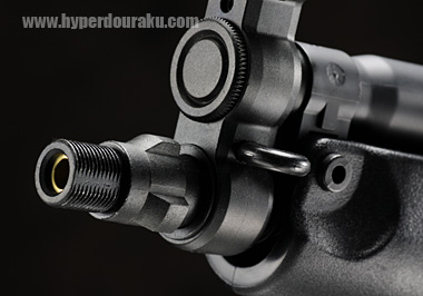 マズル部分のバレルフロントカラーを取り外せば、M14逆ネジ仕様となっているので、対応する各種サイレンサーを取り付け可能。