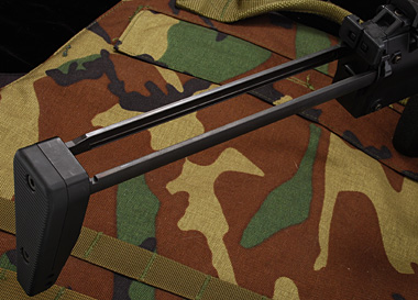 シャコッとひっぱるとスライドストックが伸びる。固定位置は一カ所だけで、つまり収納するか最大長に伸ばすかのみとなる。ハーフポジションで固定できると良かったのだが。