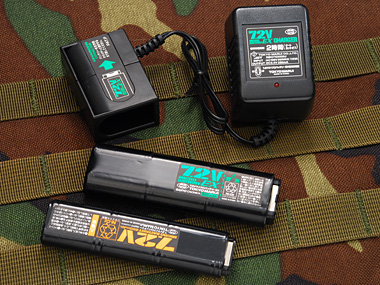 マイクロバッテリーは専用の7.2V、500mAでメーカー公称値でフルオート1700発ほど撃てるようだ。付属の専用充電器で約2時間で充電が完了する。