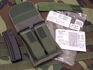 マガジンポーチはイーストAのMP5Kスタンダード2本用(商品No.308z \1,620 フロンティア91)がピッタリ。ODとブラックの2種類がある。取り付けはアリスキーパーが2本裏に付いているのでピストルベルトに簡単に装着できる。