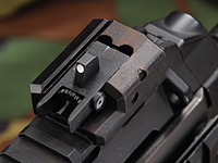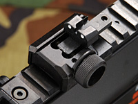 20mmマウントレイルは長いので様々な光学サイトを載せることができそう。アイアンサイトは可倒式でストックをのばして狙うときはピープサイトを立てる。