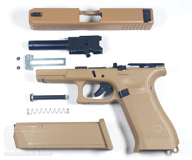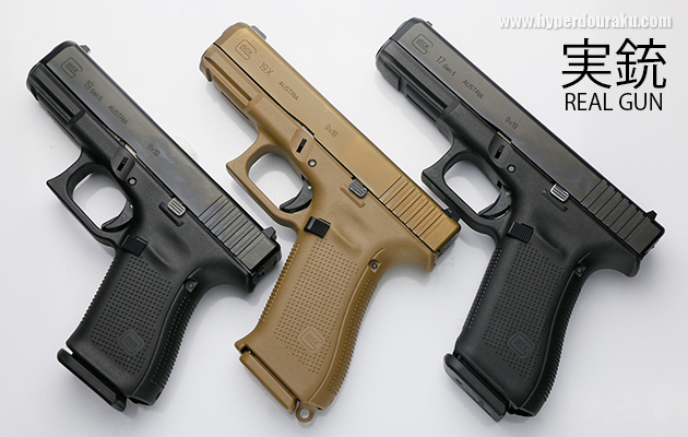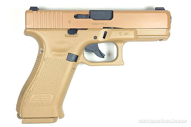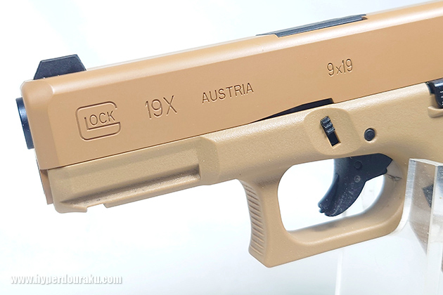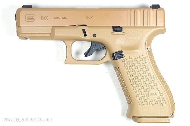 実銃のグロック 19XはG17のフルサイズグリップとG19のコンパクトスライドを融合したクロスオーバーモデルです。米軍の次世代拳銃制式採用トライアルに提出された試作型が元になっているため、全体にコヨーテカラーが採用されている点もなかなか特徴的です。