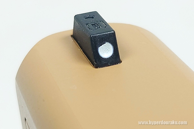 バレルのチャンバー部分にレーザーモードの切替スイッチがあります。ブローバック時にレーザーが光る条件を常時とするか、カートリッジ装填時のみとするかのどちらかのモードを選択可能です。前者に設定すればカートリッジなしの空撃ち状態でもレーザー用ターゲットと組み合わせて遊ぶことができますね。