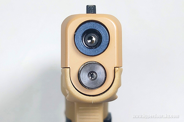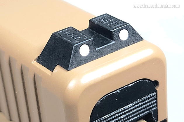 フロントサイト・リアサイトは「MH3」と呼ばれる19X標準装備の3ドットタイプが再現されています。ただ実物はスチール製ですがこちらはプラスチック。窪みにホワイトが入っていますが、爪で軽く擦ると簡単に剥がれちゃいます…。
