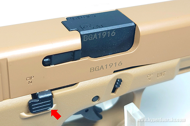 スライド左側面にはグロックロゴや19X、9×19mmといった刻印がしっかりと彫られていて文句なしです。