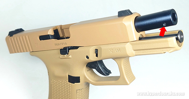 ホールドオープンするとこんな感じ。ショートリコイルはしっかりと再現されていて、バレルがティルトします。バレル前方には 3 箇所にイモネジがありまして、ここでレーザーの角度を調整することができます。