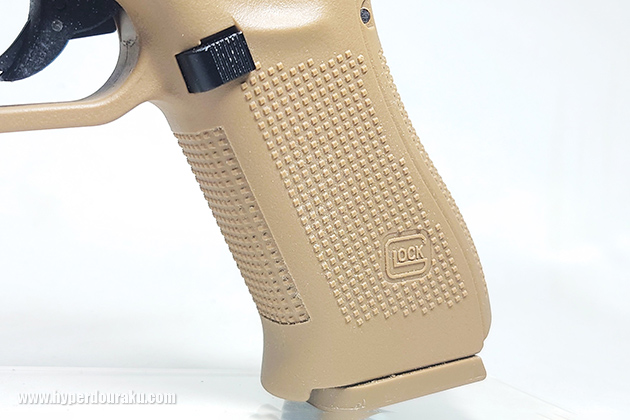 フルサイズのグリップには滑り止めとして、細かいスクエアドットのテクスチャが全面に施されています。また Gen.5世代の仕様なので、前面のフィンガーグルーヴはありません。実銃ではグリップの太さを変えるバックストラップも取り付け可能ですが、本製品には付属していないみたいです。