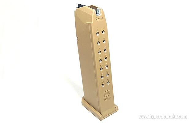 付属マガジンは実銃同様プラスチック製で、装弾数は実銃同様17発です。グロック17用のマガジンサイズとなっています後面には残弾確認用の穴が再現されています。