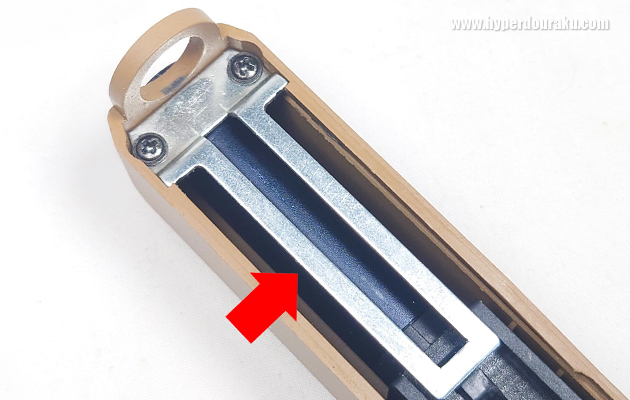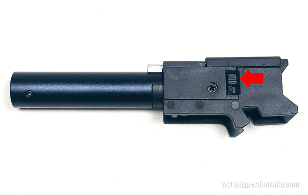 通常分解するとこんな感じ。基本手順は実銃やモデルガンに準拠しますが、スライドを後退させるための爪が引っかかるパーツがネジ止めされていて(右画像)、バレルを抜き出す前にこれを外す必要があります。またリコイルスプリングは硬さの違うものがスペアとして付属しているので、交換することでブローバックの速度が若干変化します。