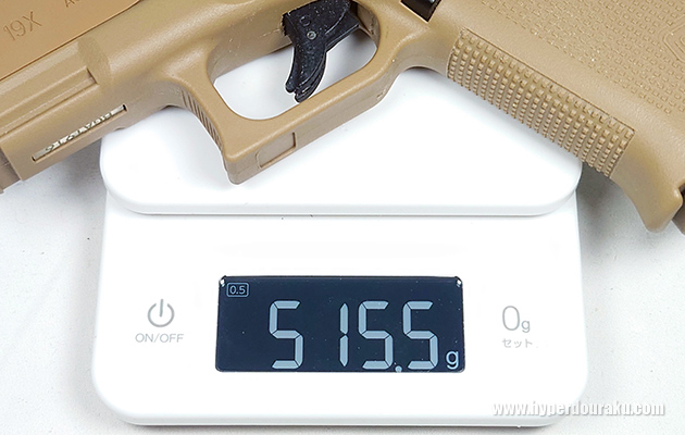 重量はフル装填のマガジンと組み合わせても515gと、とても軽いです。マガジンやカートリッジがプラスチック製ということもあって、これは致し方ないところ…。