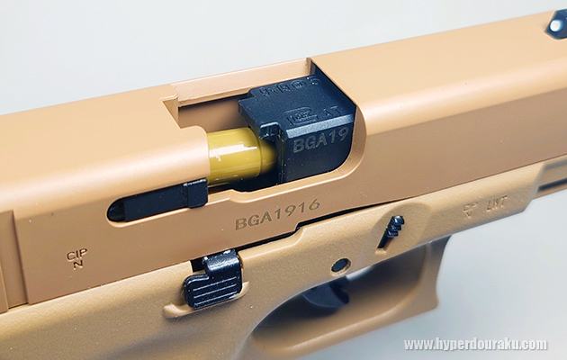 チャンバーにも9×19やグロックロゴなどの刻印があります。エキストラクターは実際にカートの排莢に用いられるため、別パーツとなっていてしっかり稼働します!