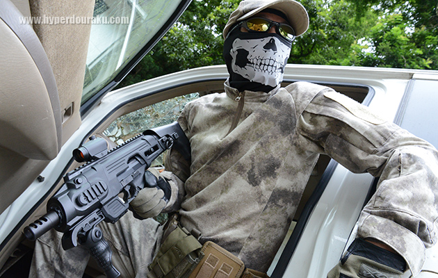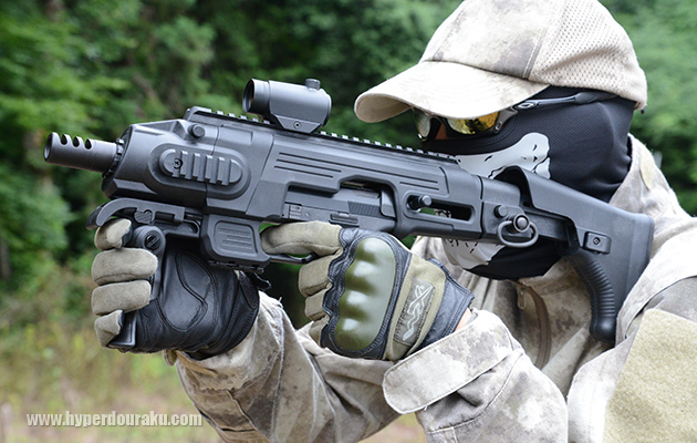 フルサイズの電動ガンでは取り回しにくい上に、至近で撃つのも相手に悪いと思ってしまうことがあります。しかし元々がハンドガンなら電動ガンに比べてもパワーは少し弱めなので、罪悪感も少なくて済みます(笑)。そしてストックがあることでしっかり狙えます。状況に応じて、分解してハンドガン単体でも戦えます。