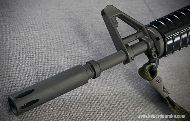 大型のフラッシュハイダーはXM177E2の大きな特徴だ。バレルは11.5インチ。SEALsやグリーンベレーといった米特殊部隊用カービンの先駆けとしてベトナム戦争に投入された。