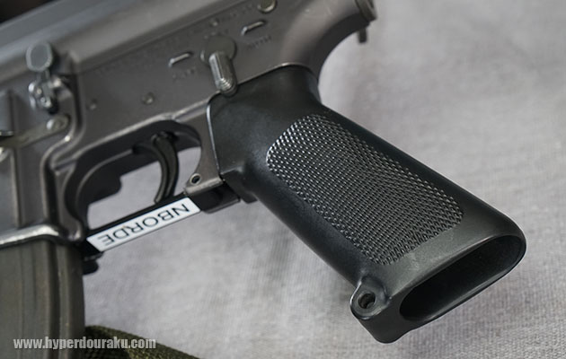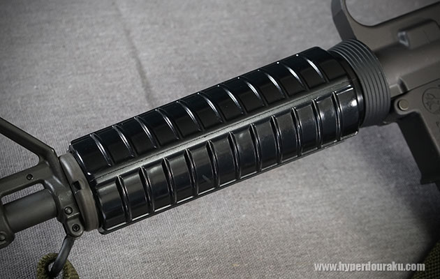 樹脂製ハンドガードはM4カービンに比べて細身。もちろん内部にはアルミ製の遮熱版、ガスチューブも再現される。
