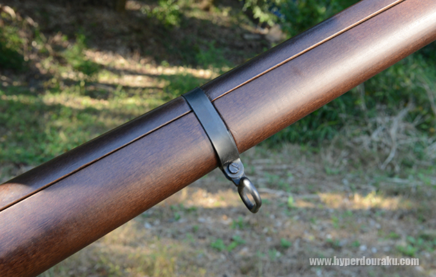 ハンドガード留めとスリングスイベルを兼ねたリングがあり、このネジを緩めて可変ホップアップのスクリューにアクセスする。