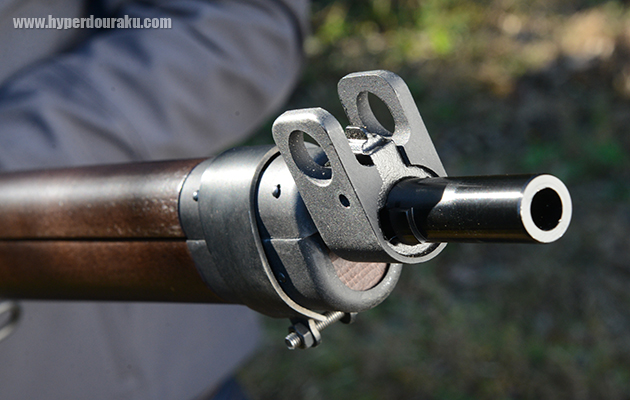 フロントサイトとマズルまわり。フロントサイトガード、アウターバレル共に金属製。