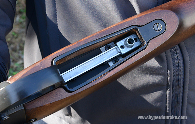 コッキングストロークは約80mm。コッキングの際にギャリギャリっとスプリングを引きずる感覚があるのが気になった。また、しっかりとコッキングしないとシアが掛かりにくいので確実な操作を心掛ける必要がある。