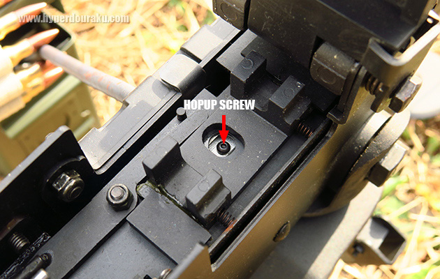 丁度、実銃でチェンバーに当たる場所にあるネジがホップです。付属の六角レンチホップ調整を行います。