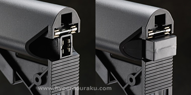 バットプレートを取り外すと、ストックの側面チューブに二股になっているSOPMODバッテリーを差し込む。