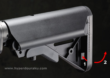 頬付けはとてもしやすい。両側側面の出っ張った部分にバッテリーを内蔵できるようになっている。実銃でもこの中に予備の電池を収納できるようになっており、これを電動ガンのバッテリースペースとして利用する考えは以前よりあった。