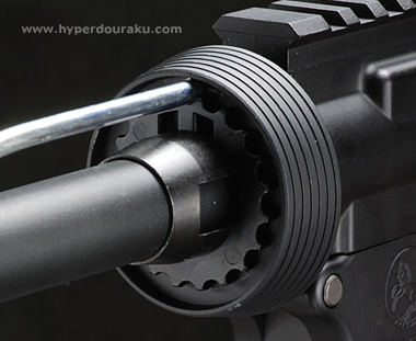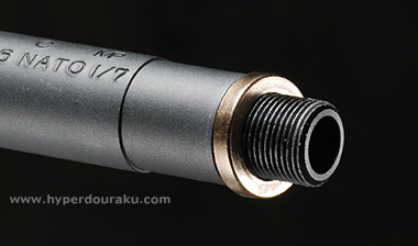 ギサギザのバレルナットが再現されている。従来もM733やM4-Sシステムで再現されていたが、これはプラ製ではなくバレル基部パーツと一体になった亜鉛ダイキャスト製。