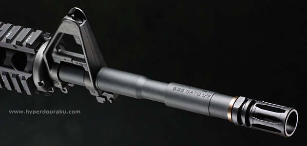 M4カービンの14.5インチバレル。中央でくびれているのはグレネードランチャー装着時のフックを固定するため。バレル上面には5.56 NATO 1/7と、5.56mm NATO弾と7インチで1回転するライフリングの表記がある。バレル先端のフラッシュハイダーはアドバンスド・バードケージタイプで射撃時に土煙を上げないように下方には火炎孔がないもの。